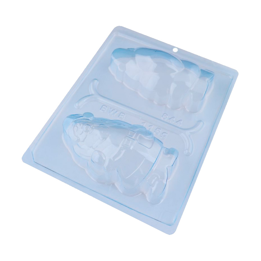Forma com 2 cavidades, Material: Acetato, Composição: Pet, Produto Atoxico, Dimensões Cavidade: 13,5 x 7,5 x 4,5, Reutilizavel, Peso da casca: 115g, Quantidade: 3 partes (2 rigidos, 1 silicone)