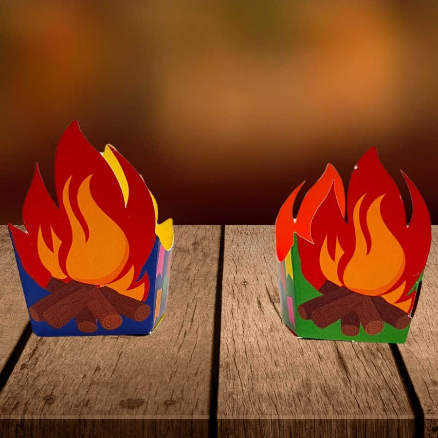 Forminha temática em formato cachepot com estampa de fogueira. Medindo 5,5x4cm, é ideal para doces típicos e festas juninas.