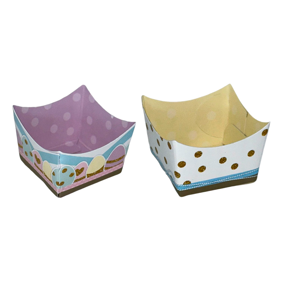 Com um fundo branco salpicado de pontos dourados cintilantes em um modelo e faixas diagonais azul-claras realçando uma linha de ovos de Páscoa em desenhos vibrantes no outro, essas formosas forminhas são a escolha perfeita para adicionar um toque de elegância e festividade à sua mesa.