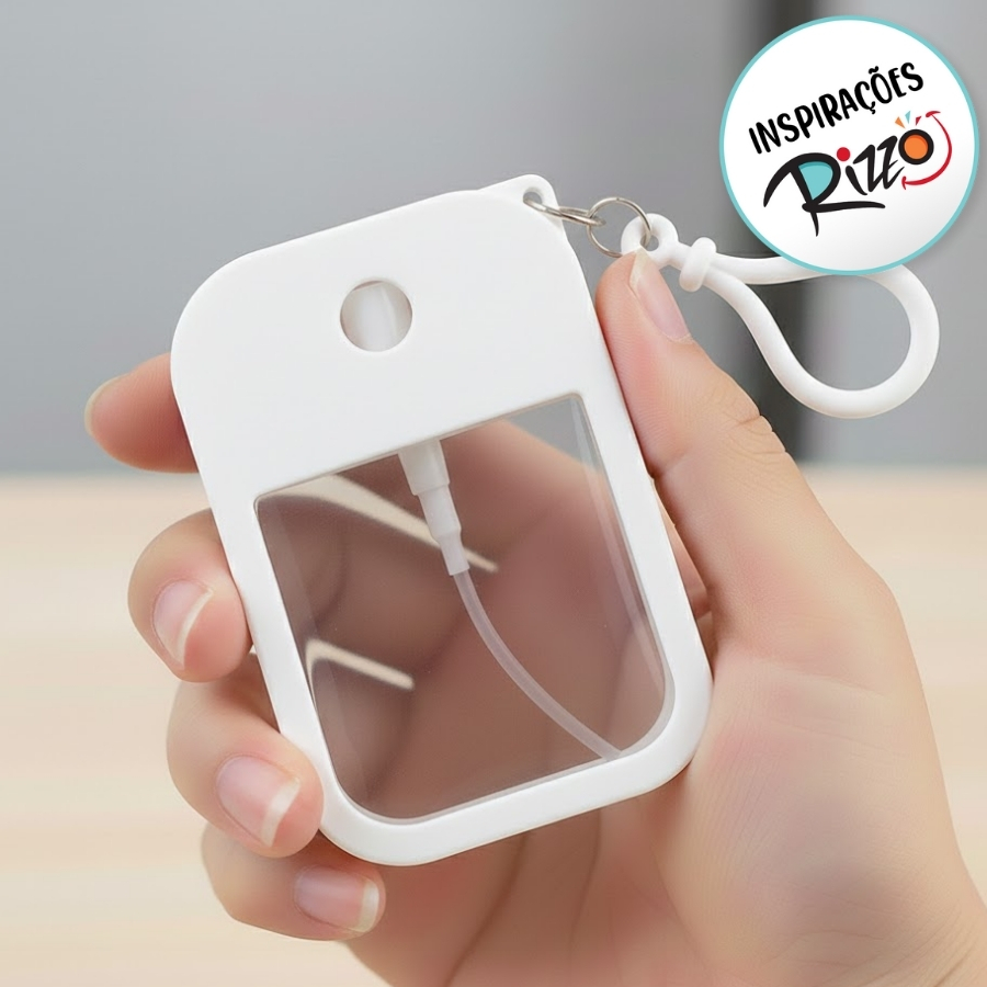 Este é um frasco pulverizador com design plano e formato de cartão, comportando 38ml de volume. O frasco interno é envolto por uma capa protetora de silicone na cor Branco, que proporciona durabilidade e uma estética neutra. Possui um bico spray que garante a distribuição fina e uniforme do líquido. Equipado com um gancho mosquetão, transforma-se em um prático chaveiro spray, ideal para o transporte externo e imediato. É um recipiente totalmente recarregável e fácil de limpar, perfeito para ser usado como frasco para álcool líquido ou cosméticos.