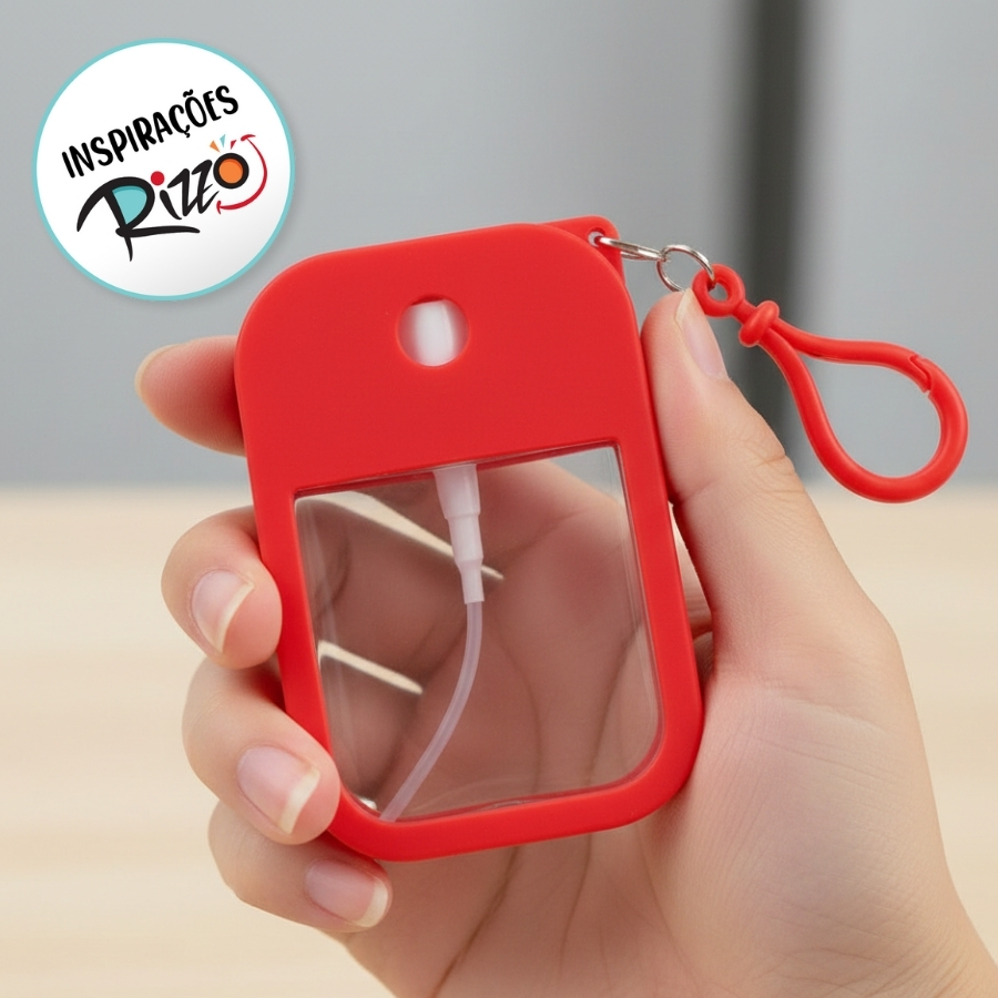 Este é um recipiente pulverizador de formato plano e design de cartão, com capacidade de 38ml. O frasco interno possui um bico spray que garante a distribuição fina do líquido em névoa. O exterior é revestido por uma capa protetora de silicone na cor Vermelho, que aumenta a durabilidade e oferece uma pegada segura. O gancho acoplado permite a fixação externa, tornando-o um prático spray para viagem. É um produto totalmente recarregável e fácil de usar, sendo ideal para transportar álcool 70° e fluidos de baixa viscosidade.