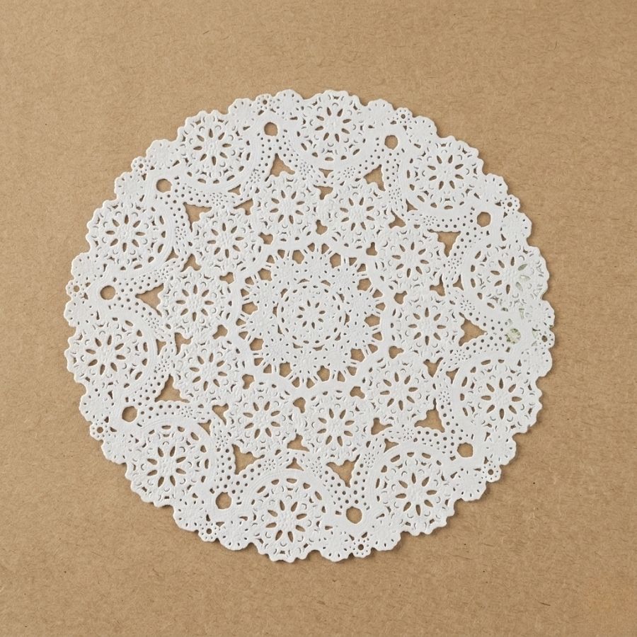 Fundo rendado de papel branco com 25 cm, ideal para decorar e valorizar a apresentação de doces, bolos, bandejas e produtos de confeitaria.