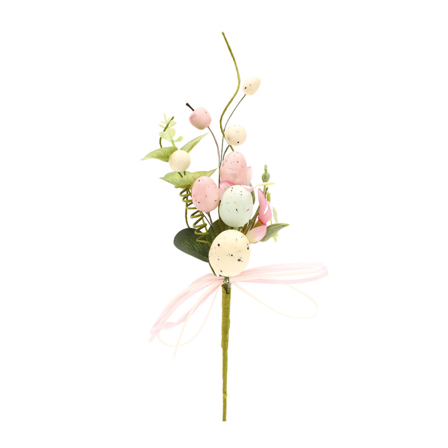 Galho decorativo de folhas e ovos de codorna, e com um laço