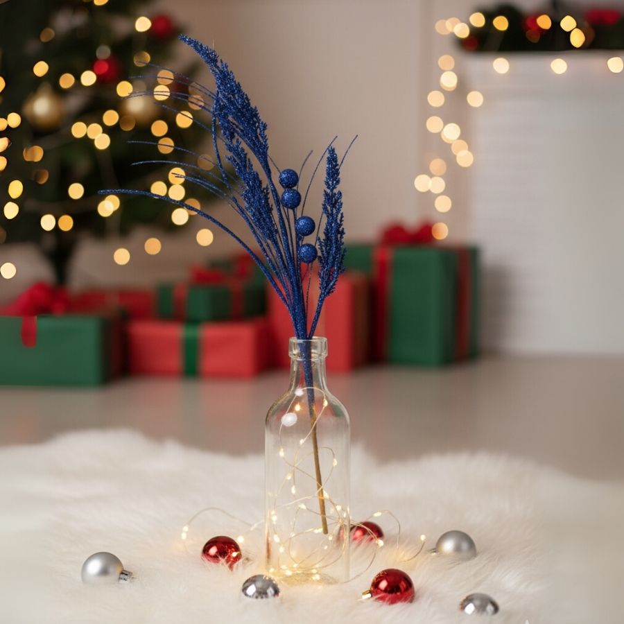 O Galho Decorativo de Natal Com Glitter - Folhas e Frutas - Azul Marinho - 77,5x21x8,5cm é sofisticado, versátil e ideal para enriquecer árvores, arranjos e guirlandas com estilo e brilho.