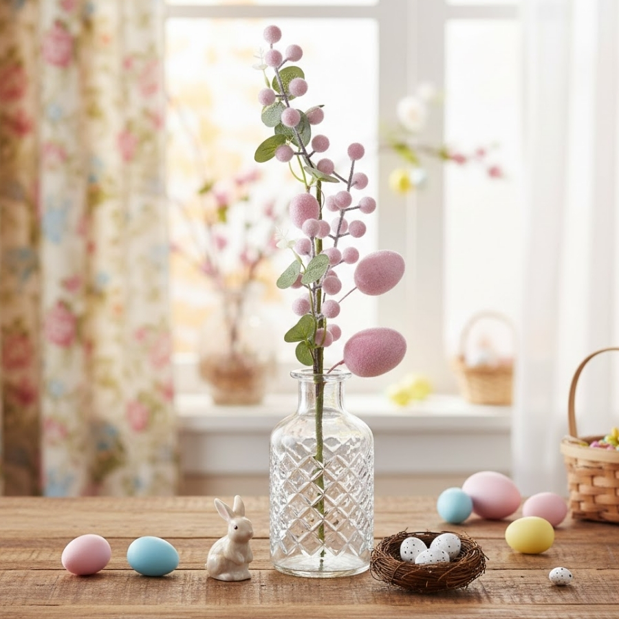 O galho decorativo de Páscoa no modelo ovos rosas possui aproximadamente 60cm de comprimento. Desenvolvido exclusivamente para uso decorativo, é indicado para composições em vasos, arranjos temáticos, vitrines e diferentes ambientações de Páscoa.