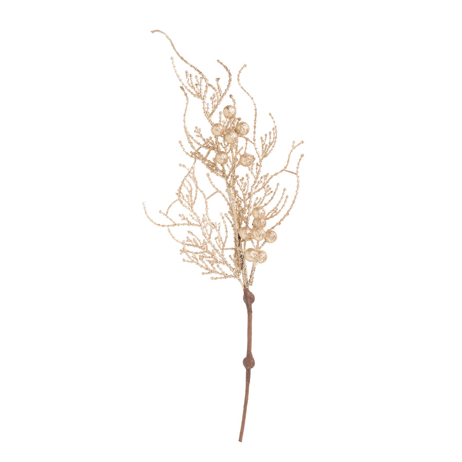 Galho decorativo, com frutinhas e galhos, totalmente cobertos por glitter champagne