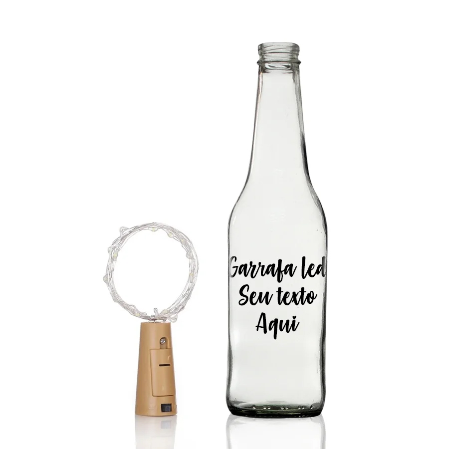 1 Garrafa de Vidro + 1 Rolha com Fio de Led + 1 Transfer personalizado (já aplicado na garrafa)