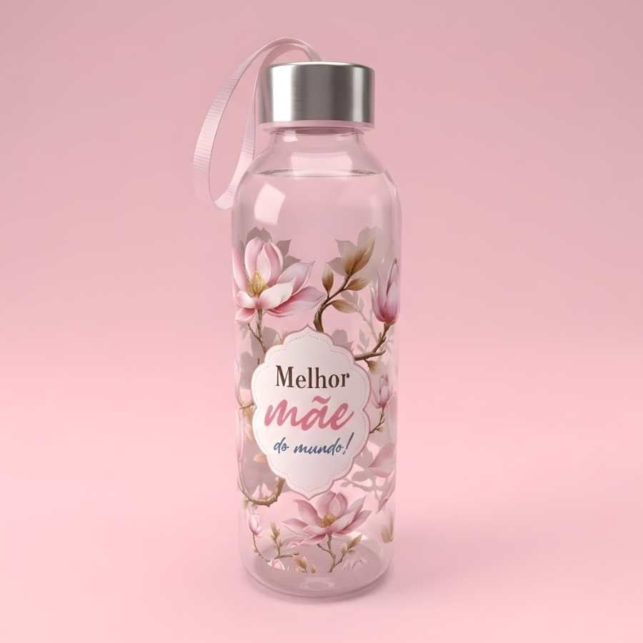 Garrafa fabricada em material plástico transparente, com capacidade de 550ml. Possui alça para transporte. Estampa de galho com flores e frase “Melhor Mãe do Mundo”. Indicada para armazenamento de bebidas. Recomenda-se higienizar antes do primeiro uso. Verificar no rótulo informações sobre resistência térmica e compatibilidade com líquidos quentes ou frios. Não utilizar em micro-ondas, salvo indicação expressa do fabricante. Evitar quedas, impactos e produtos abrasivos para preservar a estampa e a integridade do material.