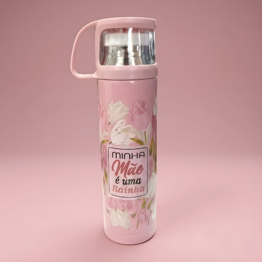 Garrafa térmica com capacidade de 470ml, acabamento na cor rosa e estampa com a frase “Minha Mãe é Uma Rainha”. Indicada para conservação de bebidas quentes ou frias por determinado período, conforme especificação do fabricante. Recomenda-se higienizar antes do primeiro uso. Consultar o rótulo para informações sobre tempo de conservação térmica. Não utilizar em micro-ondas ou freezer, salvo indicação expressa do fabricante. Evitar quedas, impactos e produtos abrasivos para preservar a estampa e a integridade do produto.