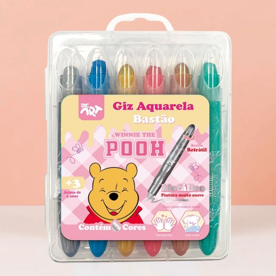 O Giz Aquarela Metálico Bastão – Ursinho Pooh Disney é um Produto Licenciado Disney ideal para estimular a criatividade infantil com cores vibrantes e efeitos metálicos deslumbrantes. Com 6 cores metálicas e ponta retrátil, este giz permite criar desenhos e trabalhos manuais cheios de vida e brilho, sem desperdícios de material. Inspirado no adorável Ursinho Pooh Disney, o giz aquarela metálico torna o momento de colorir divertido e envolvente, perfeito para atividades escolares ou para soltar a imaginação em casa.