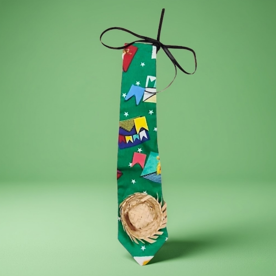 Trata-se de uma gravata de festa junina na cor verde com tema de balões, medindo 30cm. Indicada para uso decorativo. Não há informações no título sobre material, tipo de fixação ou resistência a fatores externos. Recomenda-se evitar contato com umidade e realizar o manuseio com cuidado para preservar suas características.