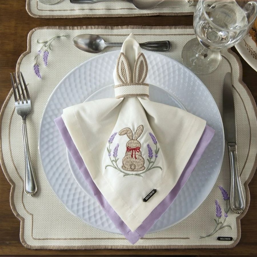 Guardanapo de tecido de Páscoa premium com porta-guardanapo bordado de lavandas, medindo 43x43cm, ideal para mesa posta sofisticada e temática.