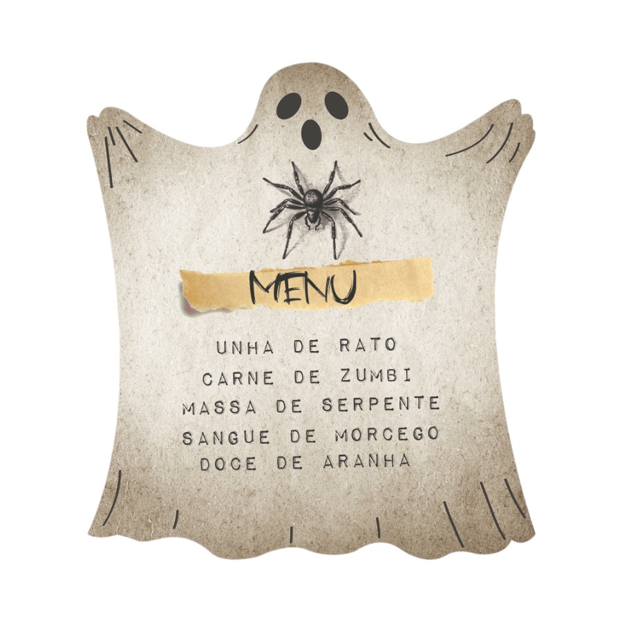 Guardanapo com temática de halloween com design de um fantasma, destacando um menu com comidas grotescas