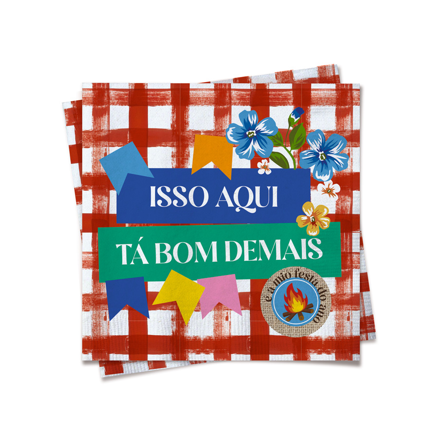 Guardanapo de papel com estampa xadrez branco e vermelho de fundo, destacando bandeirinhas, flores, e 2 retangulos que juntos formam a mensagem "Isso aqui tá bom demais" e um selo com fogueira escrita ao redor "é a mio festa do ano"