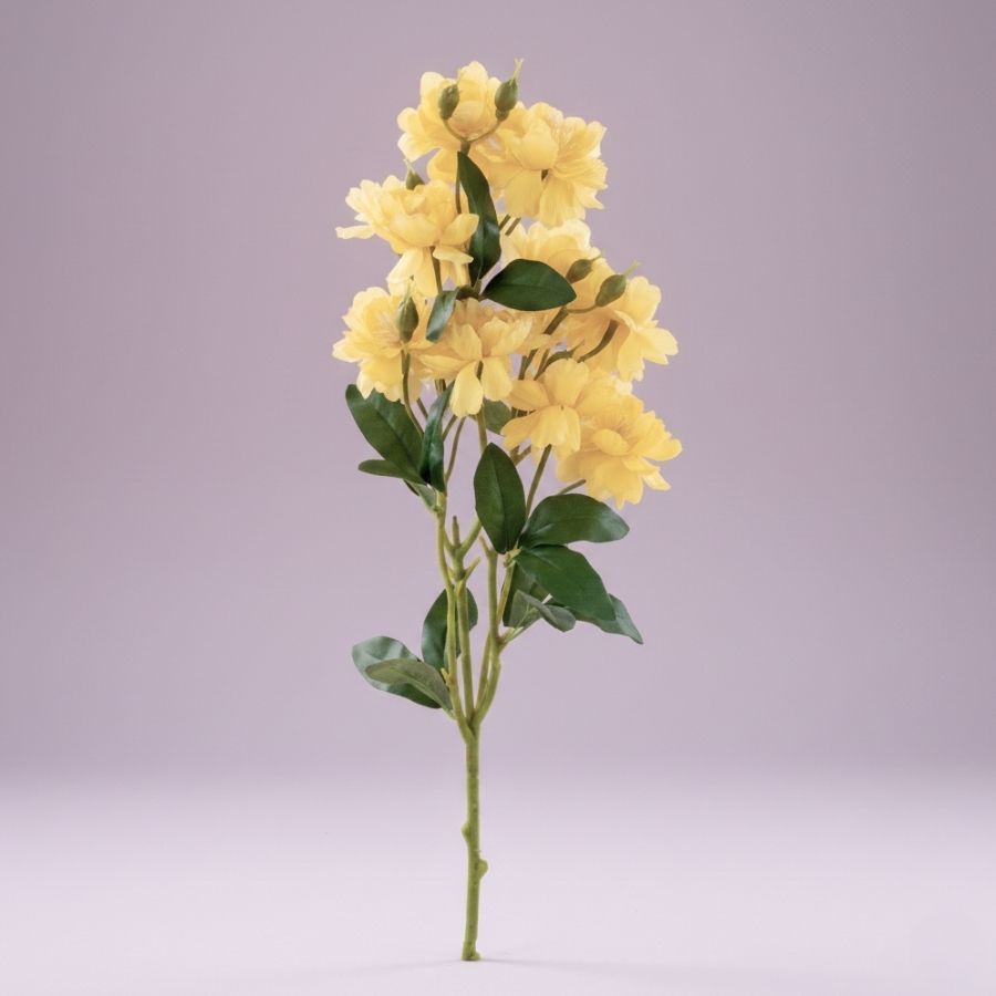 Haste permanente de Rosa Banksiae amarela com folhas, perfeita para decoração sofisticada, eventos elegantes e composições florais duráveis.