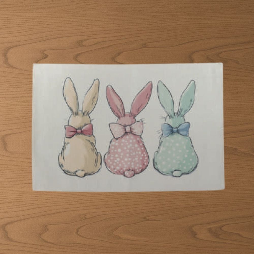 O Jogo Americano com estampa de coelhinhos coloridos é perfeito para complementar a decoração de Páscoa de forma harmoniosa e divertida. Com a mesma estampa do trilho de mesa, traz 3 coelhinhos fofos vistos de costas, nas cores amarelo, rosa e verde, todos usando delicados laços no pescoço, criando um visual lúdico e encantador para a mesa posta.