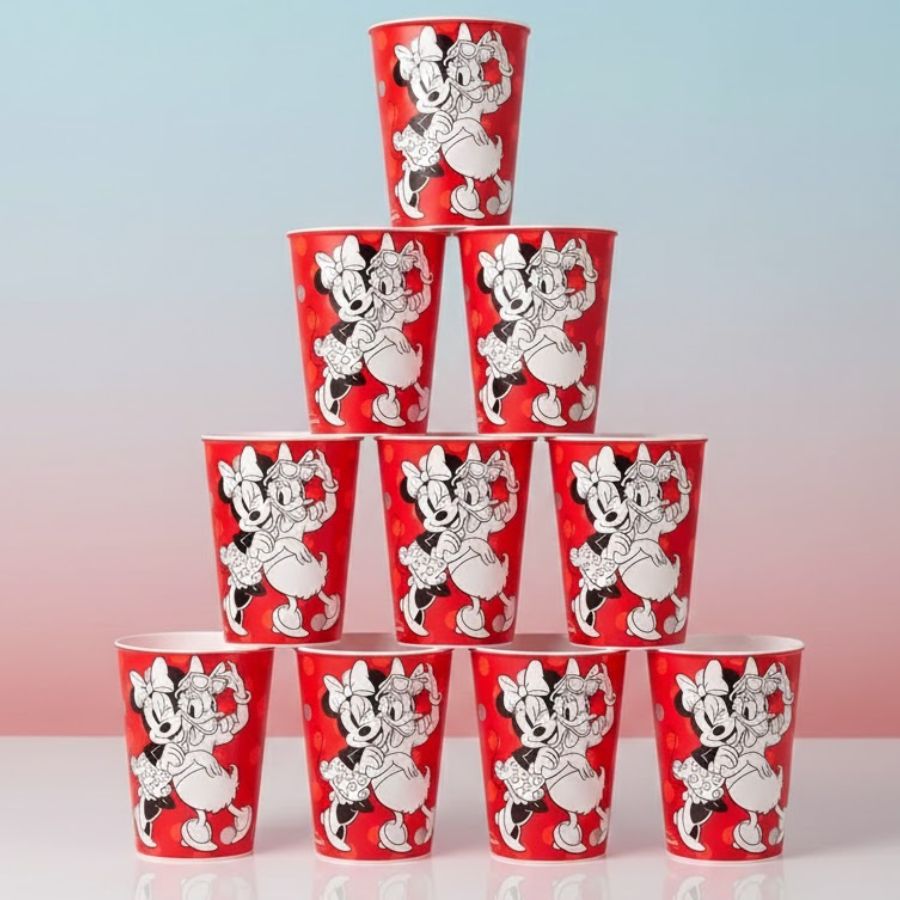 O Kit com 10 Copos para Lembrancinha inspirado em Minnie Mouse Disney e Margarida Disney, na versão vermelha, com capacidade de 320ml, é ideal para festas infantis e comemorações temáticas. Os copos são práticos para servir bebidas durante a festa e também para uso no dia a dia, auxiliando na hidratação das crianças. Um diferencial especial é que os copos possuem desenhos em branco, permitindo que a criança possa colorir com giz de cera, transformando a lembrancinha em uma atividade divertida e interativa. Sonhar, realizar e comemorar fica ainda mais simples com itens funcionais disponíveis na Loja Disney.