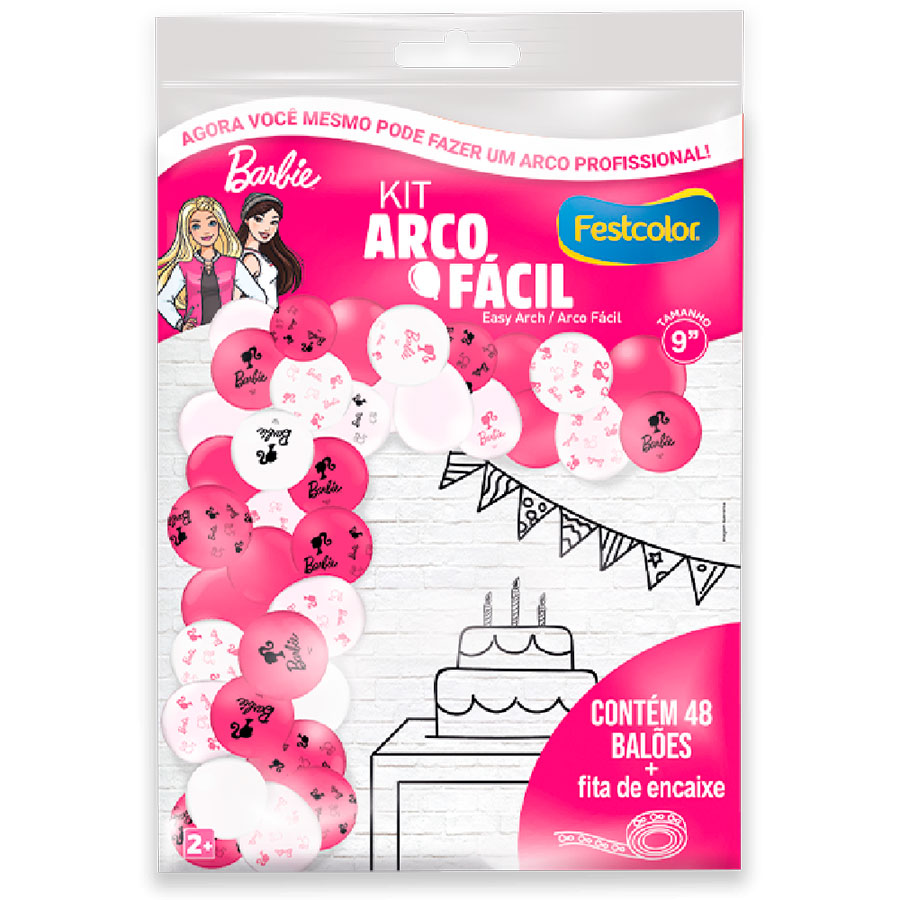 Um pacote contendo 1 kit com: uma fita para arco desconstruido e 48 balões com o tema Barbie