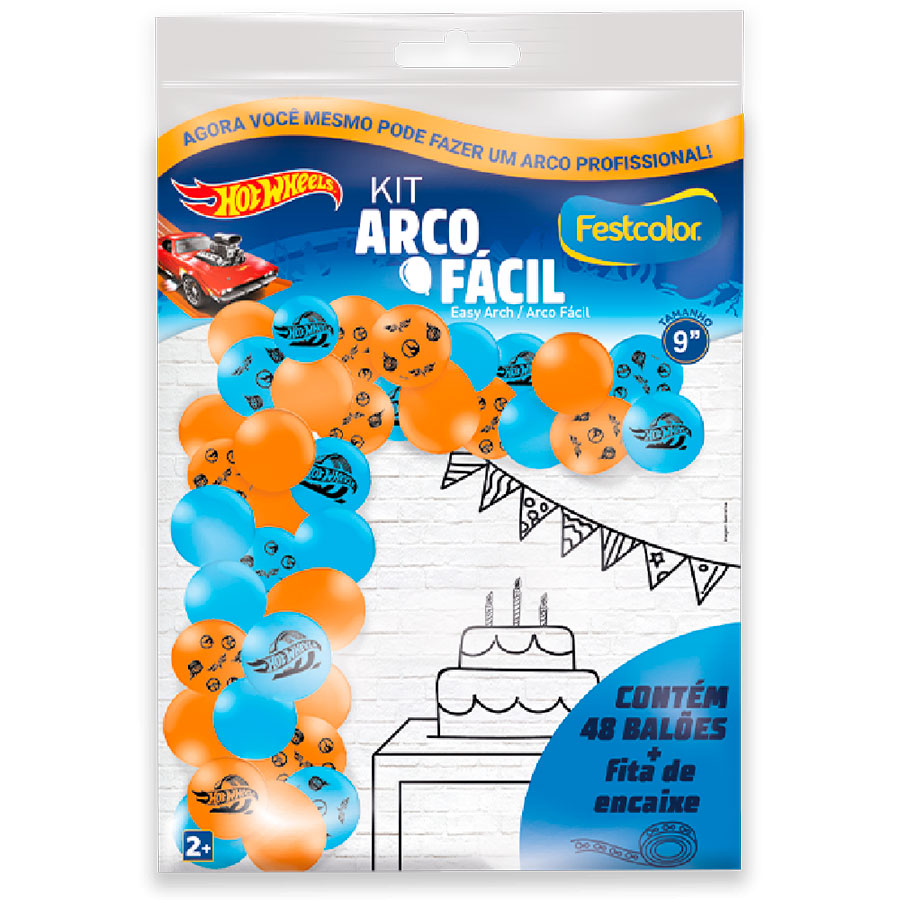 Um pacote contendo 1 kit com: uma fita para arco desconstruido e 48 balões com o tema Hot Wheels