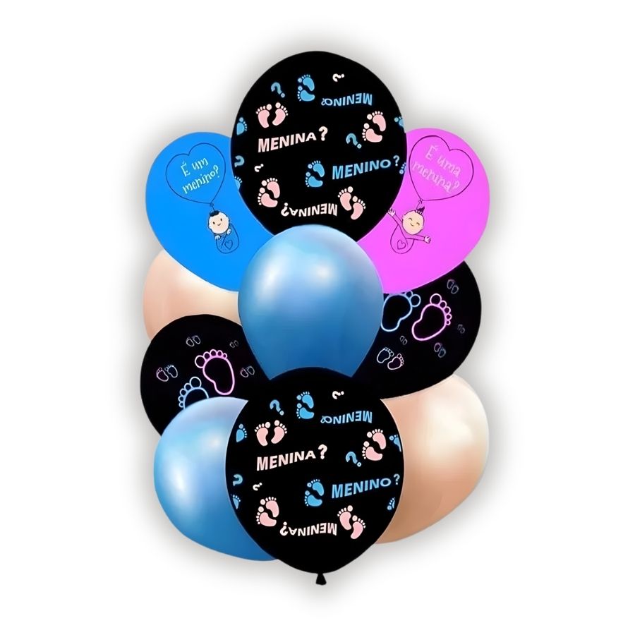 O conjunto contém: 2 balões de 16" preto temático, 2 balões de 9" alumínio rosa gold, 2 balões de 9" alumínio azul, 1 balão de 11" temático “É um menino?” azul celeste, 1 balão de 11" temático “É uma menina?” pink e 2 balões de 11" com estampa de pezinho preto. Todos os balões são de alta qualidade, garantindo excelente durabilidade e efeito visual incrível na decoração do evento.