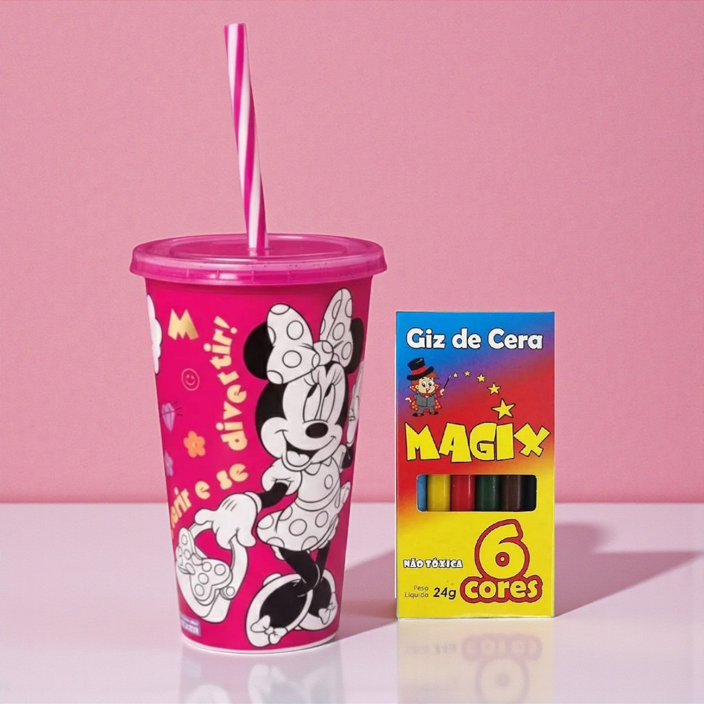 O Kit Copo com Canudo e Giz - Minnie Rosa transforma momentos simples em experiências criativas e cheias de charme. Inspirado no universo delicado da Minnie Mouse, o copo convida as crianças a explorarem a imaginação ao colorir diretamente na superfície, criando desenhos, padrões e combinações sempre diferentes. O formato com tampa e canudo torna o uso prático no dia a dia, seja em casa, na escola ou em passeios, enquanto o giz de cera com múltiplas cores amplia as possibilidades de personalização. Além de funcional, o item também se destaca como peça divertida e decorativa, despertando interesse e incentivando atividades lúdicas que envolvem expressão artística e interação.