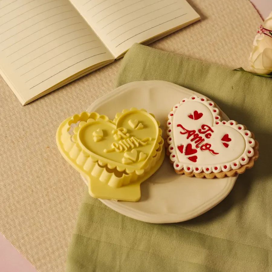 Kit de cortador e carimbo com o molde de coração e a escrita "Ter amo".