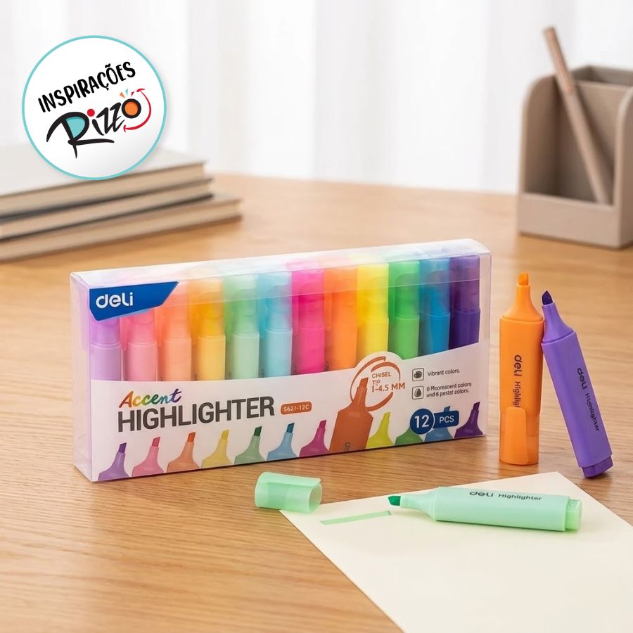 O Kit de Marca Texto Accent com 12 Cores - Ponta Cinzel 1,0-5,0mm é ideal para destacar textos com precisão e praticidade. Com cores variadas e ponta versátil, oferece traços finos e grossos, sendo perfeito para estudos, trabalho e organização no dia a dia.