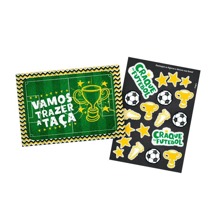 Kit decorativo feito de papel cartão tema futebol. Estampa escrita "Vamos trazer a taça" com fundo inspirado em um campo de futebol e uma taça de futebol ao lado. Fundo preto com estampas de chuteira, estrela, bola e taça, escrito "Craque do futebol".