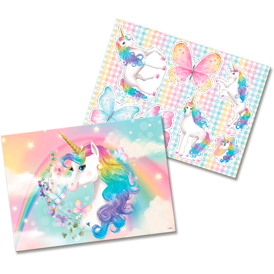 Um pacote contendo 1 painel decorativo com 8 peças destacaveis do tema Unicórnio