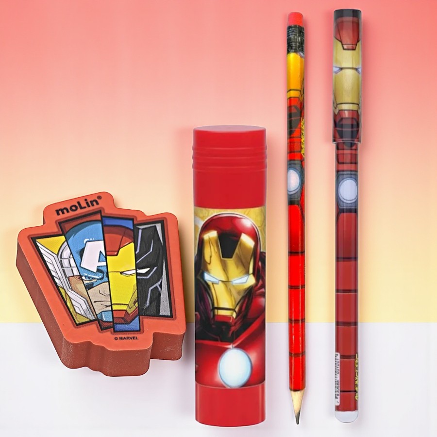 O Kit Escolar - Homem de Ferro - 4 Itens é uma opção temática e funcional para complementar o material escolar com um visual marcante inspirado no universo dos Vingadores. O conjunto é composto por 1 lápis grafite, 1 caneta esferográfica preta 1.0mm, 1 cola bastão e 1 borracha escolar, reunindo itens essenciais para a rotina de estudos e atividades diárias. Com estampa inspirada no Homem de Ferro, o kit adiciona personalidade ao momento de escrever, desenhar e organizar tarefas, tornando o uso ainda mais envolvente para fãs do herói. A combinação dos acessórios favorece a praticidade no dia a dia escolar, além de contribuir para uma composição visual temática e cheia de estilo.