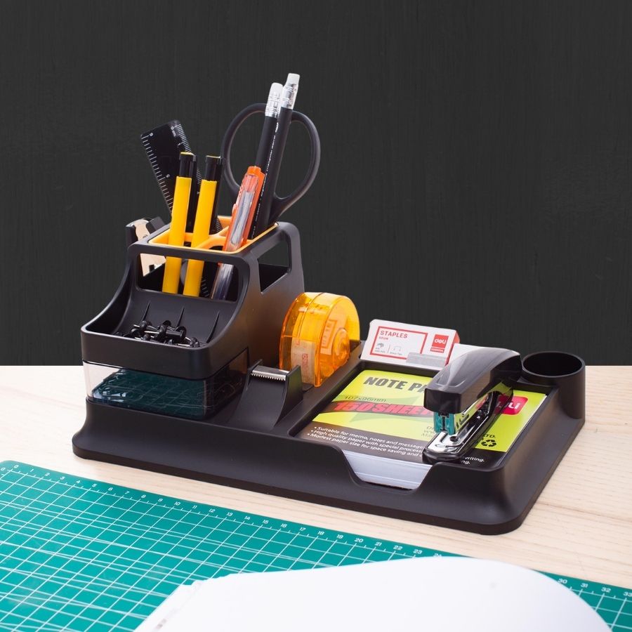 Kit de escritório com organizador de sete compartimentos e dezesseis acessórios inclusos: 1 fita adesiva, 1 bloco de notas, 1 caixa com 1000 grampos, 1 grampeador, 1 extrator de grampos, 20 clipes, 1 tesoura, 1 estilete, 2 lápis, 1 borracha, 2 lapiseiras, 1 régua e 10 tachinhas. Ideal para organizar mesas de trabalho ou estudo com praticidade.