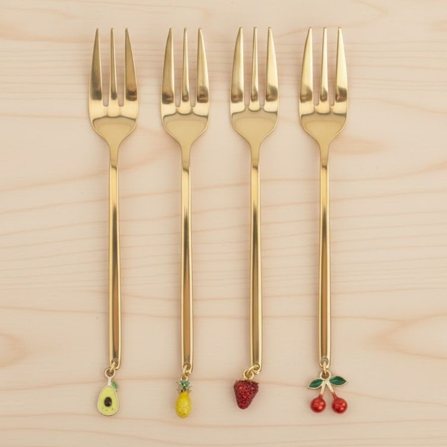 O kit de garfos para aperitivos é um item charmoso e funcional, perfeito para elevar a apresentação de petiscos e pequenas porções. Produzidos em aço inox com acabamento dourado, os garfos têm um visual elegante e delicado. Cada peça conta com um detalhe decorativo de pingente de fruta, trazendo um toque divertido e sofisticado ao mesmo tempo, ideal para composições criativas à mesa.