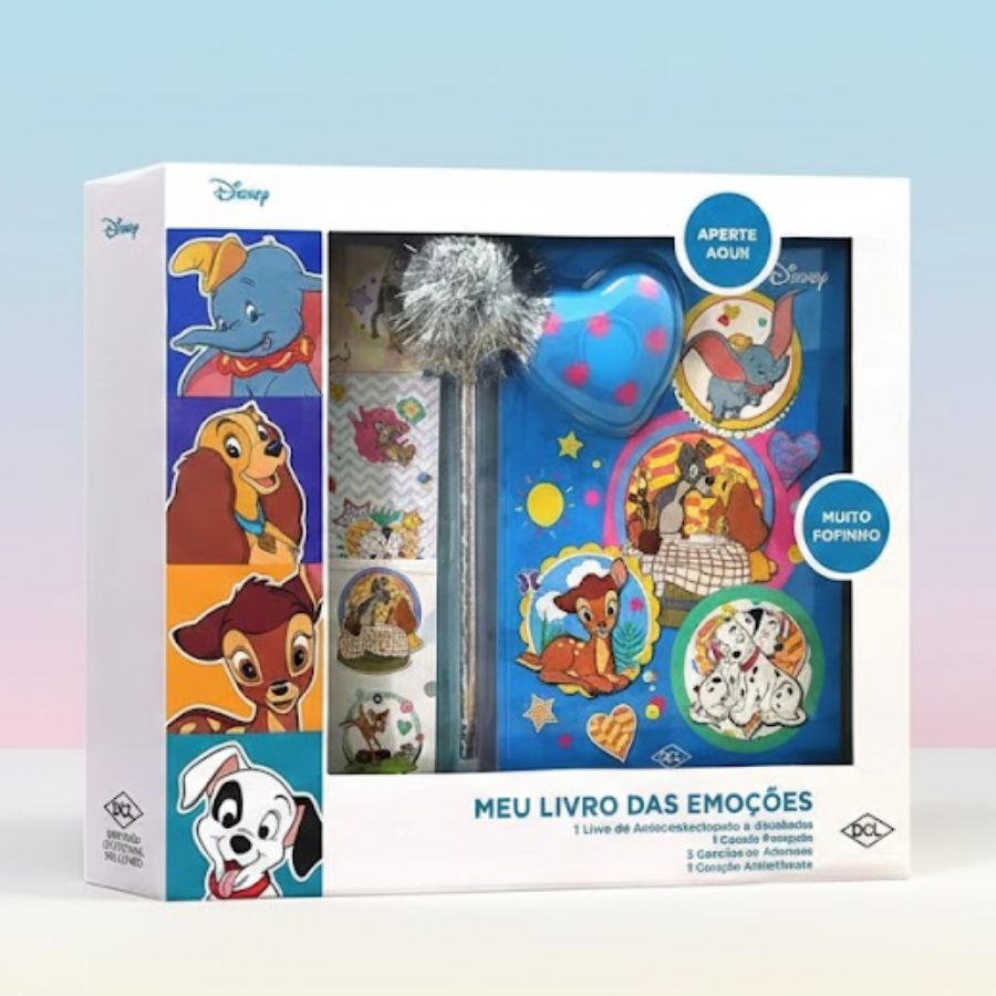 O Kit Meu Livro das Emoções inspirado nos Clássicos Disney — com figuras dos Dálmatas Disney, Dumbo Disney, Dama e o Vagabundo Disney e Bambi Disney — é um convite para as crianças explorarem seu mundo interior de maneira leve, divertida e educativa. Com atividades dirigidas, o livro incentiva registrar pensamentos, sonhos e sentimentos, promovendo autoconhecimento e reflexão. O kit inclui adesivos coloridos para personalizar as páginas e uma caneta pompom que torna cada momento de escrita ainda mais encantador. Sonhe, realize e comemore com um item especial disponível na Loja Disney Rizzo. Não recomendado para menores de 4 anos.