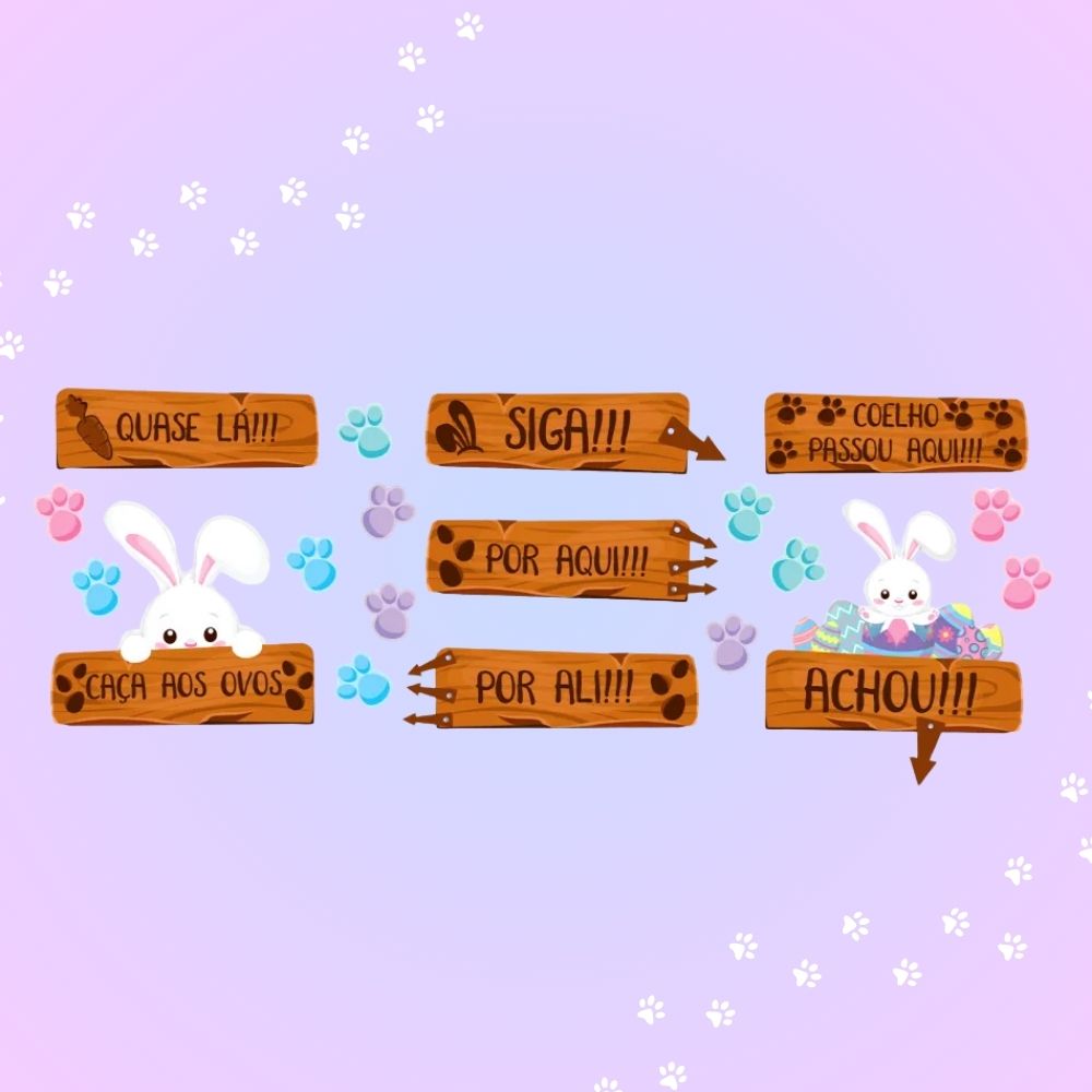 Espalhe as plaquinhas pelas paredes, portas ou móveis, seguindo uma sequência lógica de pistas. Distribua as patinhas de coelho pelo chão para indicar o trajeto da brincadeira. Combine com ovos de chocolate, cestas, balões e outros itens de Páscoa para criar uma caça aos ovos ainda mais divertida e visualmente atrativa.