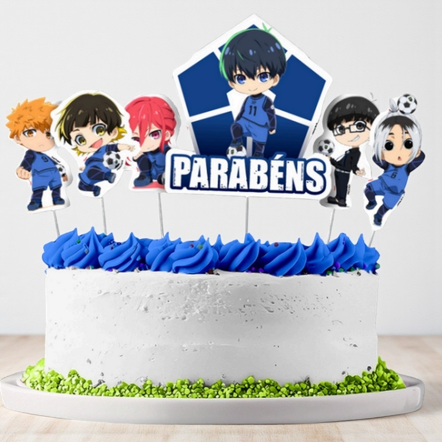 Kit topo de bolo temático Bluelock, medindo 24x9,5cm. Ideal para decorar bolos de aniversários e festas infantis, proporcionando um acabamento criativo e personalizado à decoração.