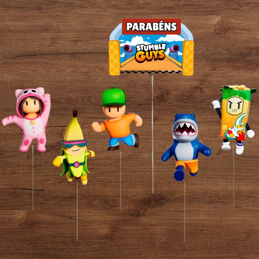 Destaque o bolo da festa com o Kit Topo de Bolo Stumble Guys! Inspirado no jogo que faz sucesso entre crianças e adolescentes, este kit é ideal para deixar o bolo mais divertido, colorido e em sintonia com a decoração temática, garantindo um ponto focal que encanta os convidados.