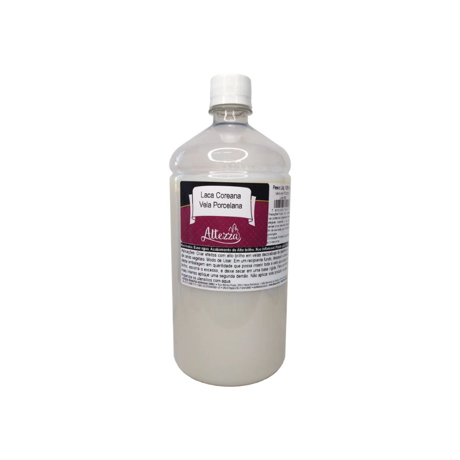 A Laca Coreana para Vela de Porcelana de 1 litro é um produto não tóxico, base água e não inflamável, que confere alto brilho a velas de parafina ou ceras vegetais. De uso profissional, o volume de 1L oferece excelente rendimento. Para usar, basta imergir a vela no produto e secar, podendo aplicar uma segunda demão para intensificar o brilho. Não deve ser aplicada no pavio e a limpeza dos utensílios é feita com água.