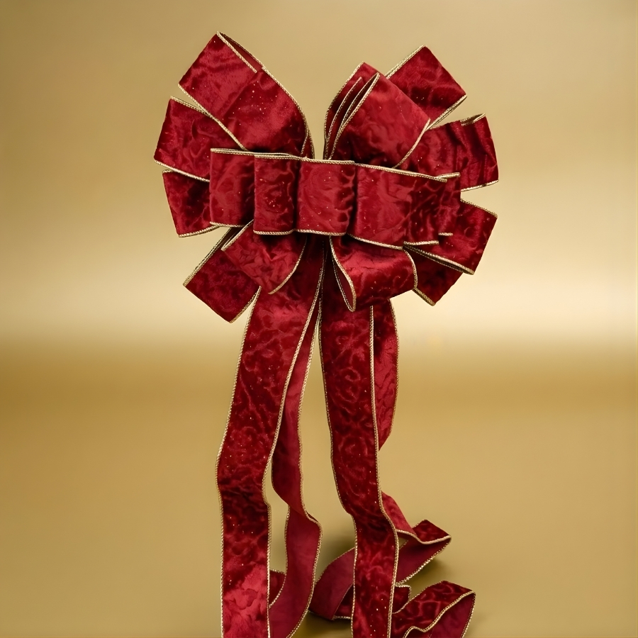 Laço decorativo com acabamento em veludo na cor vermelha e borda dourada, medindo aproximadamente 33cm por 135cm. Indicado para uso decorativo em ambientes, árvores de Natal, embalagens e composições temáticas. Produto de uso ornamental. Recomenda-se evitar contato com umidade e atrito excessivo para preservar o acabamento em veludo.