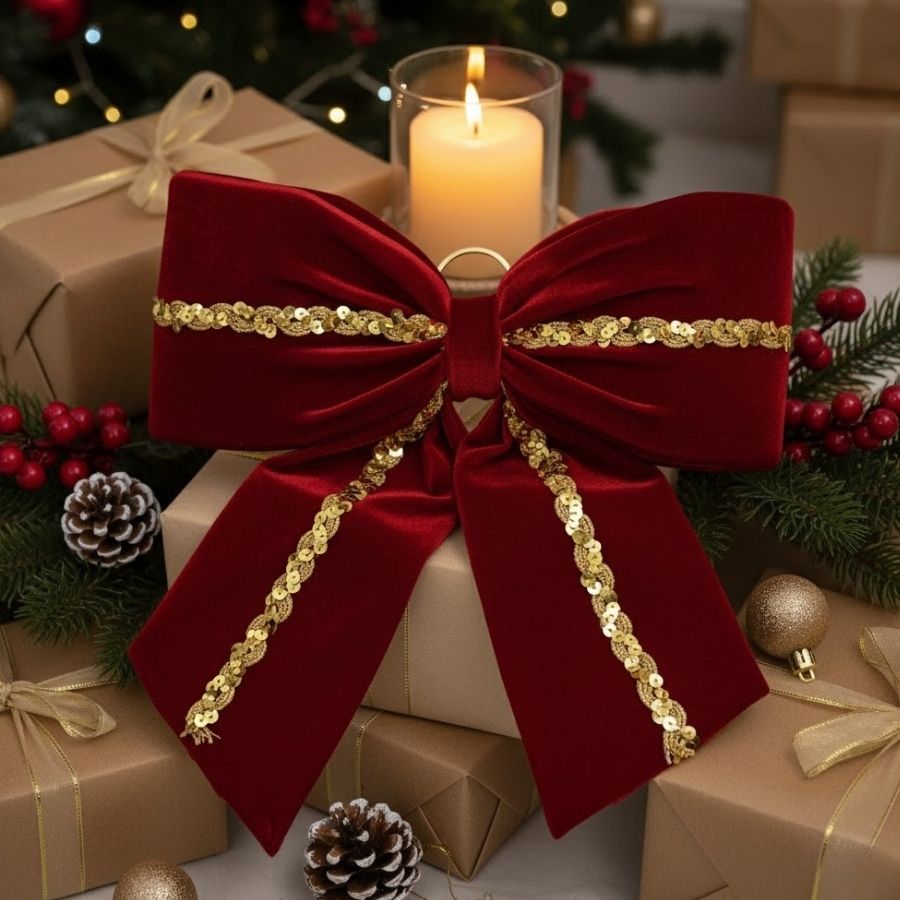 Com estrutura firme e laço já moldado, é fácil de aplicar e garante um visual impecável em poucos segundos. O contraste entre o vermelho intenso e os detalhes dourados reflete a essência do Natal, trazendo elegância, brilho e tradição à decoração.