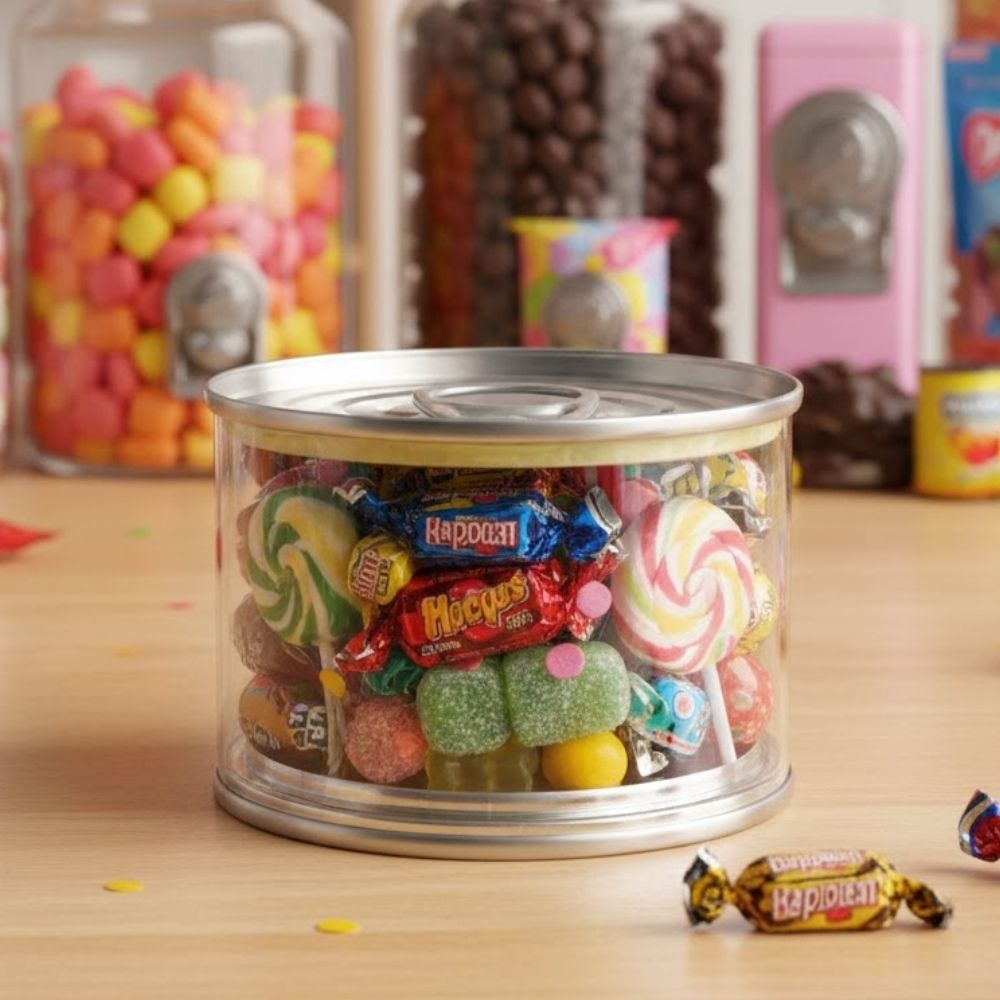 Conta com sistema abre-fácil com anel na parte superior, no estilo das tradicionais latas tipo sardinha. O diferencial é que o fundo também pode ser aberto, funcionando como uma tampa comum, facilitando o enchimento com doces, brindes ou pequenos acessórios antes da finalização. Uma embalagem metálica versátil que une praticidade e apresentação diferenciada.