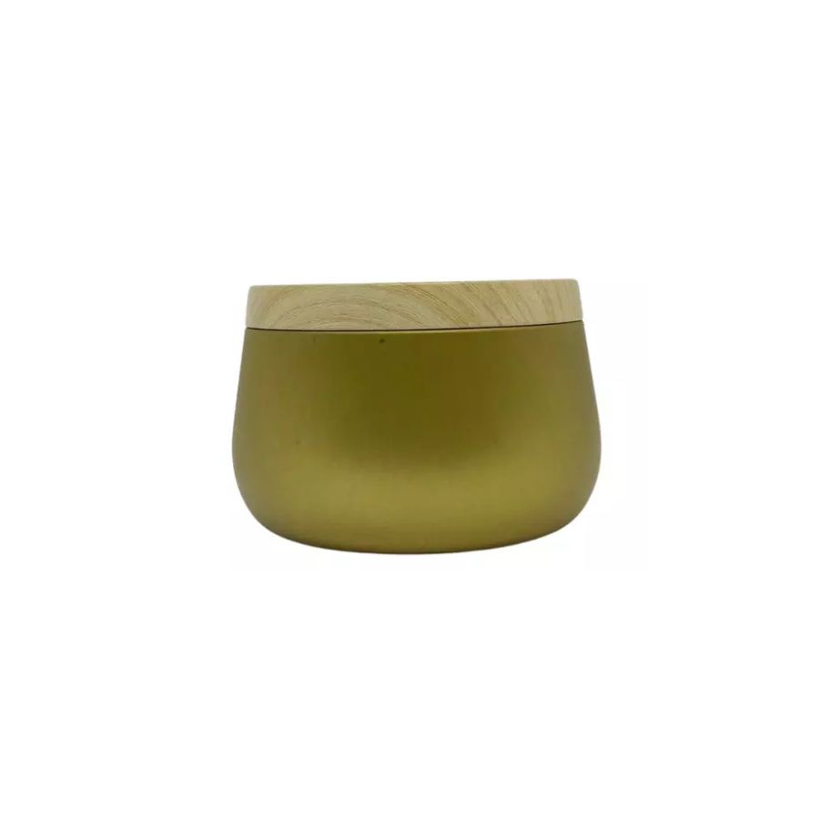 A Lata de Metal com Tampa Estampa Madeira na cor dourada, com capacidade de 120ml e medidas de 6,5cm de diâmetro por 5cm de altura, é um recipiente metálico versátil, ideal para embalagens diversas, incluindo velas artesanais. Sua robustez e o design com estampa de madeira conferem um toque de elegância e funcionalidade.
