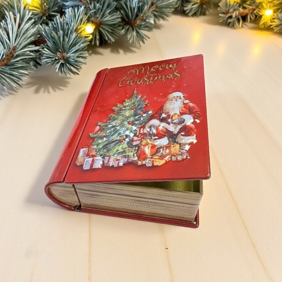 Lata de metal em formato de livro com temática Noel Clássico, 11,5x10x3,8cm, ideal para doces, kits de presente e decoração natalina artesanal.