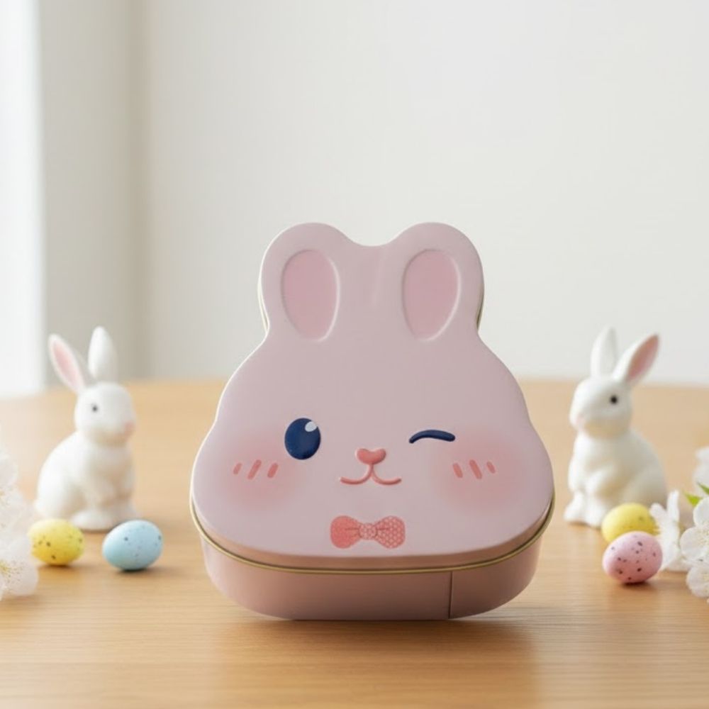 A Lata de Metal em formato de cabeça de coelhinho é um item decorativo encantador e cheio de personalidade. Na cor rosa, o coelho possui uma expressão divertida, com um olhinho piscando, o que deixa a peça ainda mais fofa e atrativa. O detalhe da gravata complementa o visual delicado, tornando a lata perfeita para composições temáticas, especialmente de Páscoa, decoração infantil ou criativa.