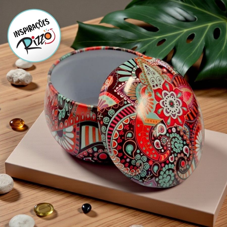 A Lata de Metal com Estampa de Mandala nas cores azul e vermelho é uma embalagem decorativa moderna e cheia de personalidade, ideal para valorizar lembrancinhas, presentes e kits especiais. Seu design inspirado em mandalas proporciona um visual marcante e sofisticado, perfeito para diversas ocasiões. Com dimensões de 7x7x4cm e capacidade de 130ml, é compacta e prática para armazenar pequenos itens.