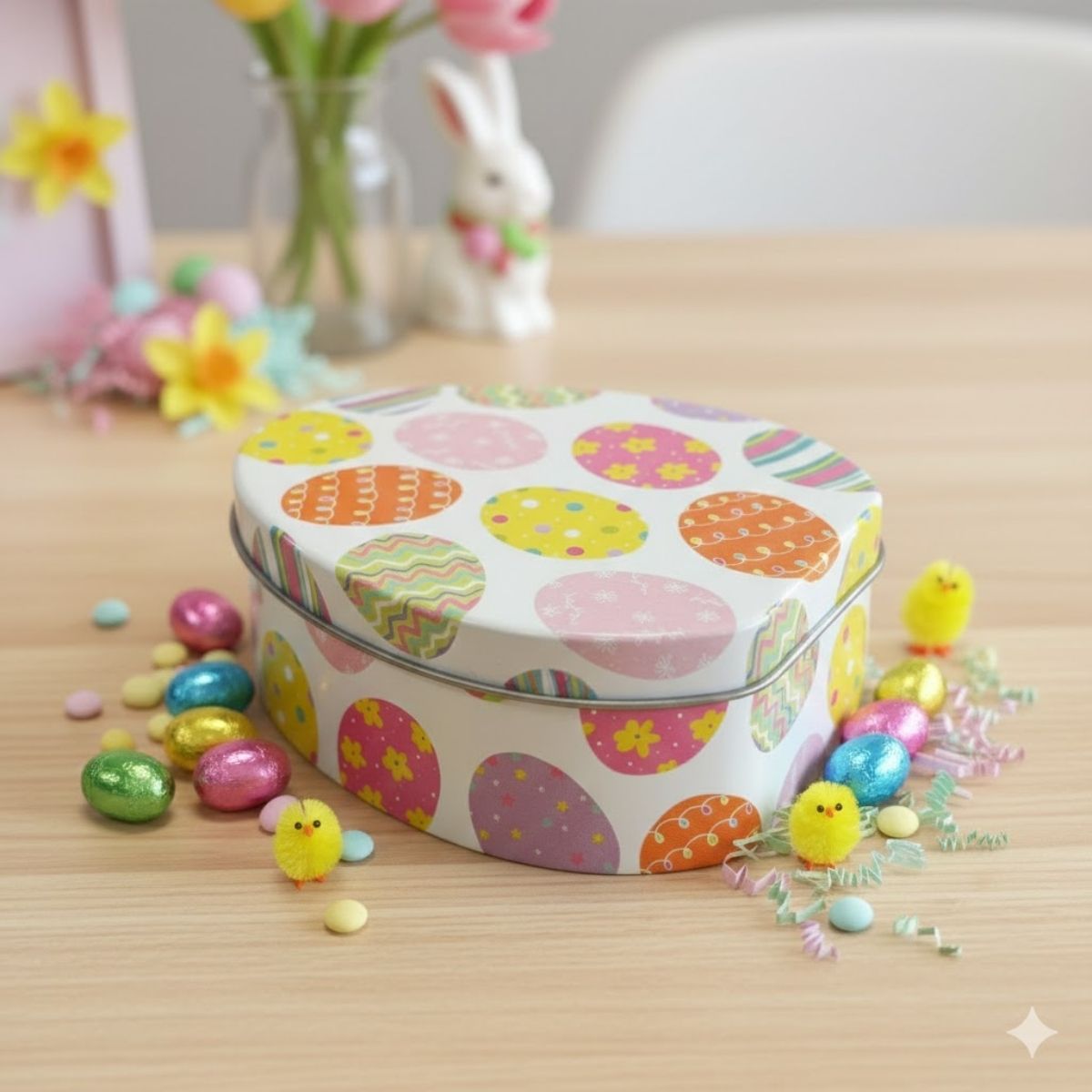A lata metálica em formato de ovo apresenta um design encantador em fundo branco, totalmente estampada com ovinhos coloridos em diferentes padrões, como poás, listras e flores, criando um visual alegre e perfeito para celebrar a Páscoa com estilo. Seu acabamento é delicado e vibrante, ideal para quem busca uma opção temática e charmosa para presentear.