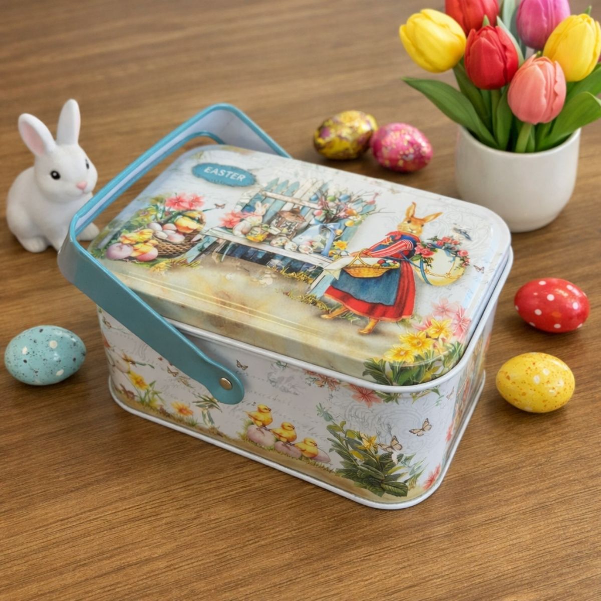Com 10,5x8x6cm e alça turquesa sólida, esta lata oferece praticidade para transporte e uso, mantendo uma estética cuidadosamente trabalhada. Toda sua superfície é decorada com pintinhos, ovos, flores, borboletas e textos de Páscoa, tornando-a ideal como peça de decoração, embalagem presenteável ou organizador temático para miudezas.