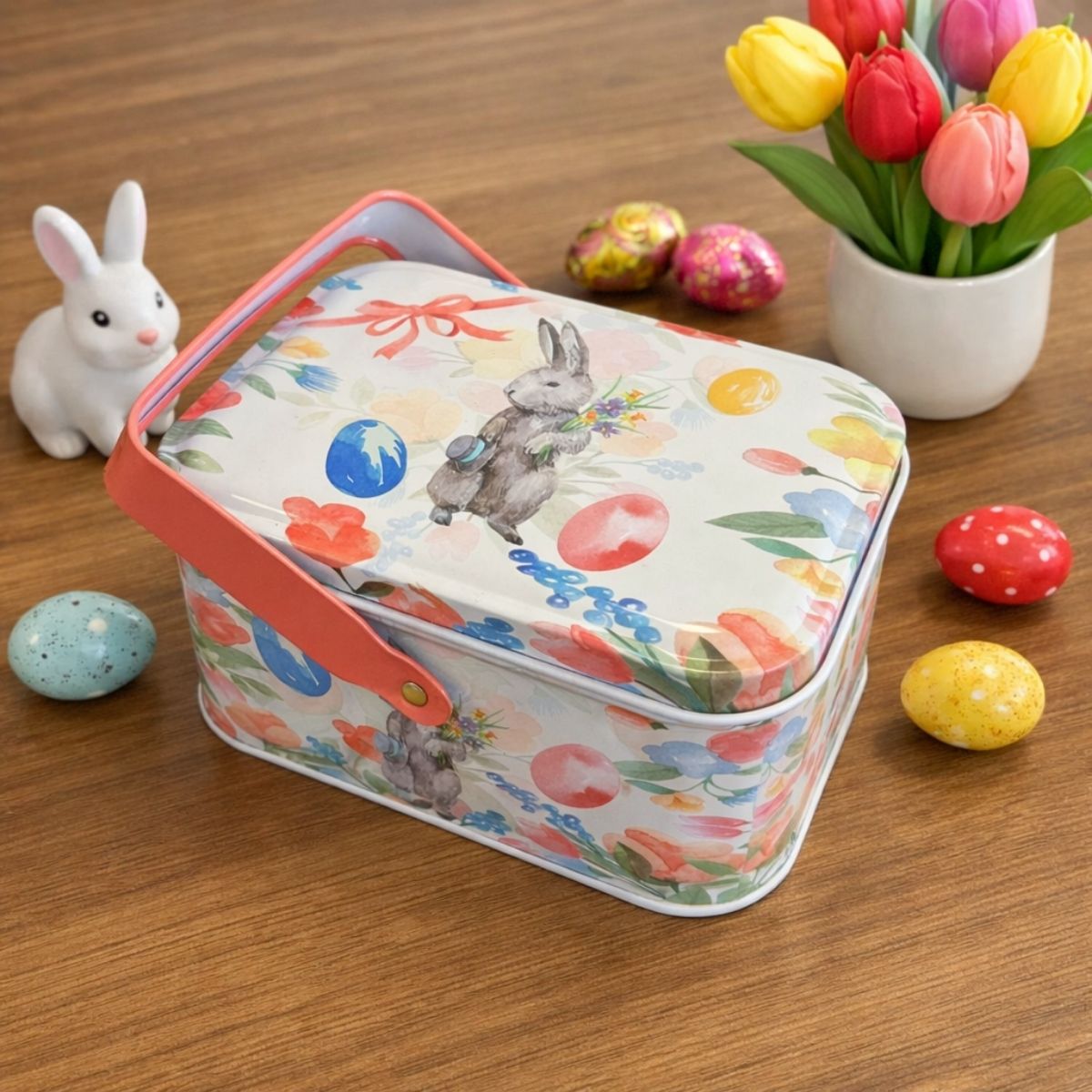 A lata de metal retangular de Páscoa com estampa de coelho cinza e ovos coloridos é um item decorativo encantador e funcional, perfeito para compor cestas, lembrancinhas e decorações temáticas. Seu design é super detalhado, com ilustração delicada e acabamento bonito, trazendo o clima pascal de forma suave e alegre.