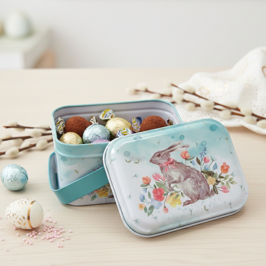 Com uma alça funcional, essa lata facilita o transporte e pode ser reutilizada de diversas formas, tornando-se um acessório versátil para a Páscoa. Seu design sofisticado e os detalhes delicados fazem dela uma opção perfeita para compor mesas decoradas, presentear com estilo ou simplesmente colecionar.