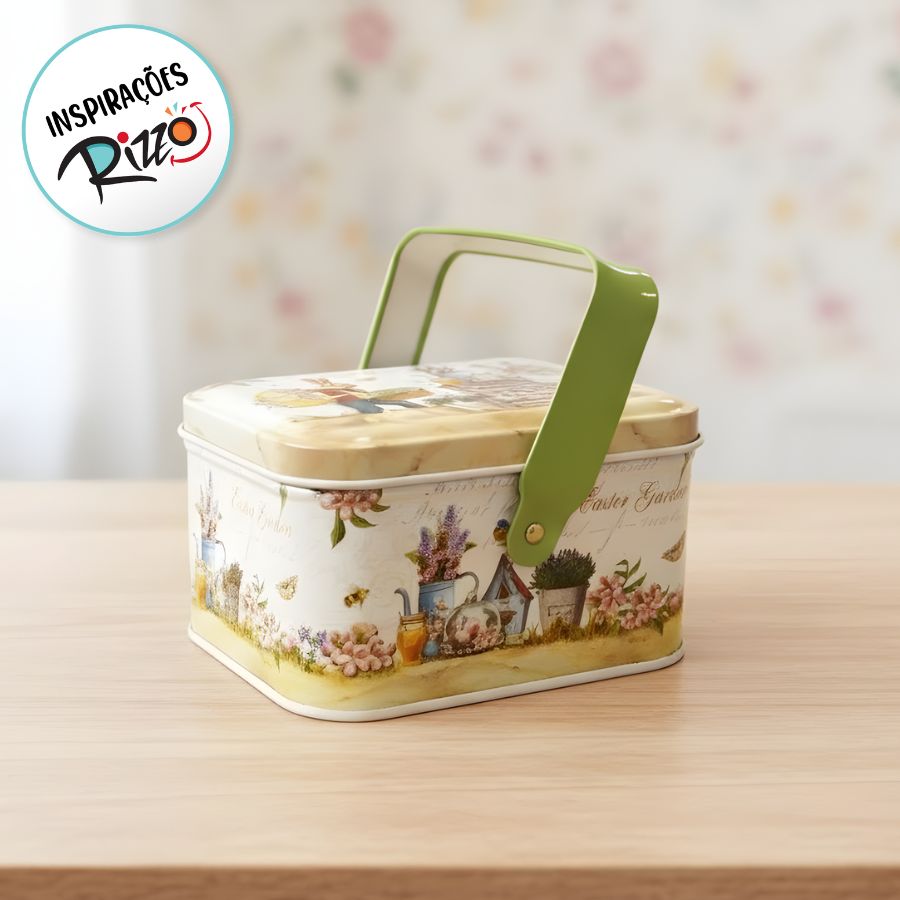 A Lata de Metal Retangular com Alça de Páscoa – Coelho em Jardim de Páscoa – 10,5x8x6cm é uma embalagem metálica decorativa, com alça para transporte e espaço para pequenos doces, lembrancinhas ou objetos temáticos. Seu design detalhado em metal torna a peça durável e ideal para uso sazonal.