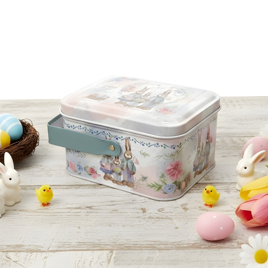 A Lata de Metal Retangular com Alça de Páscoa Verde - Família de Coelhinhos - 10,5x8x6cm é uma opção prática e decorativa para composições temáticas de Páscoa. Indicada para lembrancinhas, kits presenteáveis e organização de pequenos itens, essa lata ajuda a valorizar a apresentação de produtos sazonais, atendendo à necessidade de embalagens temáticas compactas, resistentes e visualmente atrativas.